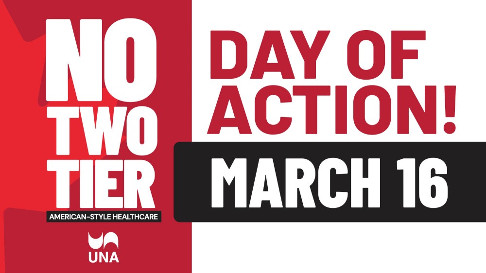 On Monday, March 16th, Canadians from coast to coast will hold a National Day of Action for Public Health Care. United Nurses of Alberta strongly encourages its members and supporters of public health care to send a message to Ottawa demanding that our federal government enforce the Canada Health Act and save public health care from the threat of Alberta's Bill 11.