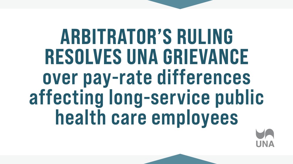 Grievances filed by UNA that arose from differences between rates of pay for some employees in their new multi-employer collective agreement and the rates actually paid by major Alberta public health care employers have been resolved by an arbitrator...[more]